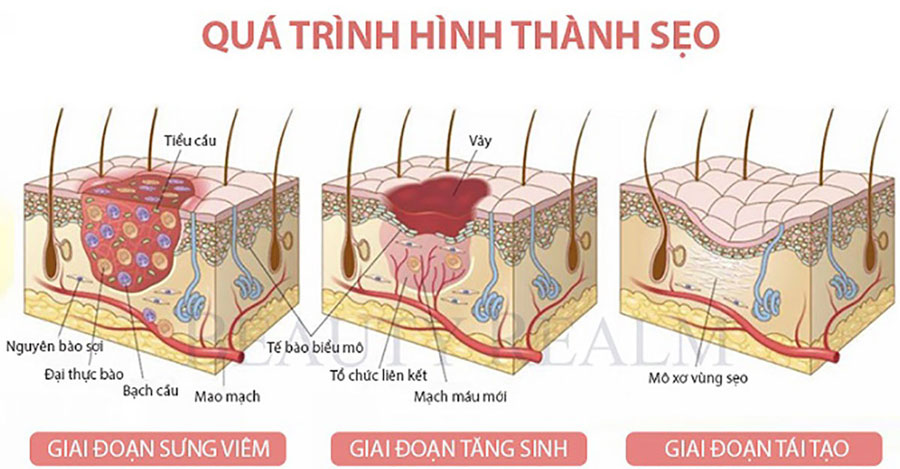 Để hiểu rõ nguyên nhân hình thành sẹo lồi, cần nhìn vào quá trình lành vết thương của da. Khi da bị tổn thương do trầy xước, phẫu thuật, mụn hoặc bỏng, cơ thể sẽ trải qua ba giai đoạn phục hồi chính.